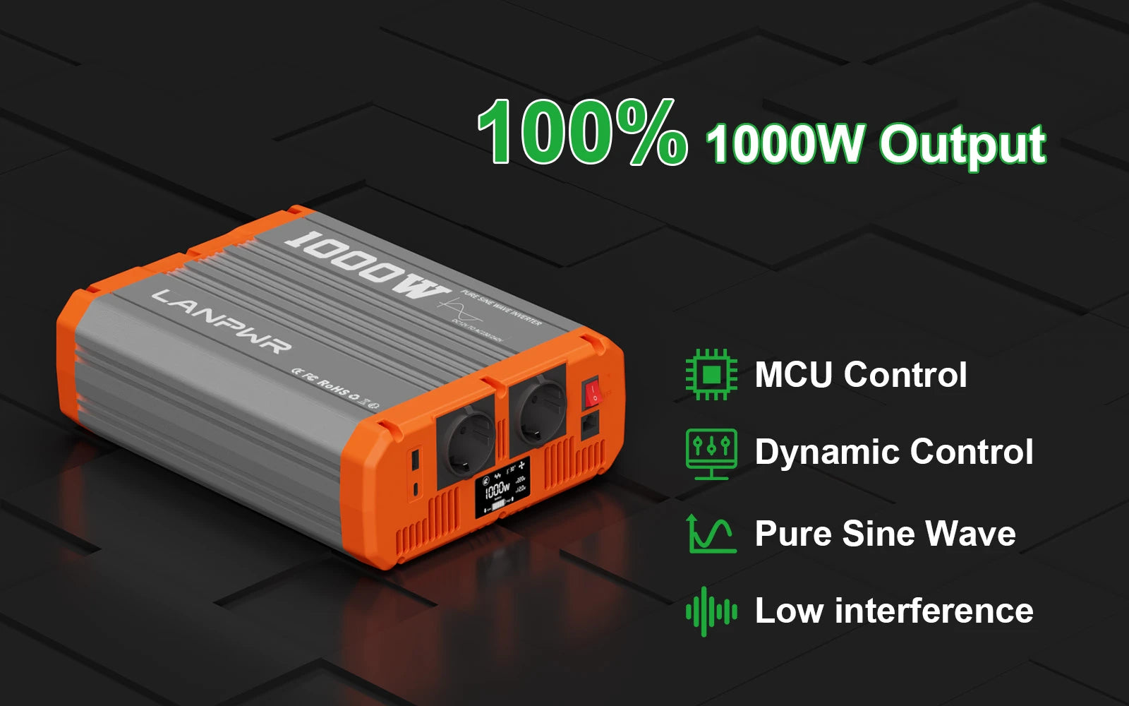 LANPWR 1000W Pure Sine Wave Inverter provides seamless and continuous 1000W power output to ensure that you can use all kinds of electrical appliances with peace of mind in any situation. Its high-quality power output not only ensures the normal operation of the equipment, but also prolongs the service life of the equipment in an invisible way. It has been rigorously tested and verified to be true and reliable, defying any kind of testing.