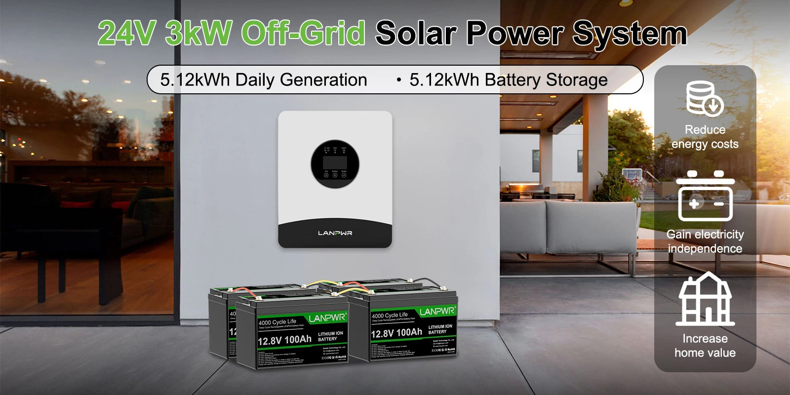 LANPWR 1080Wp 3000W 24V 5.12kWh Off‑Grid Solar Kit - 24V 3000W Off-grid Inverter, 4x12V 100Ah LiFePO4 Lithium Battery