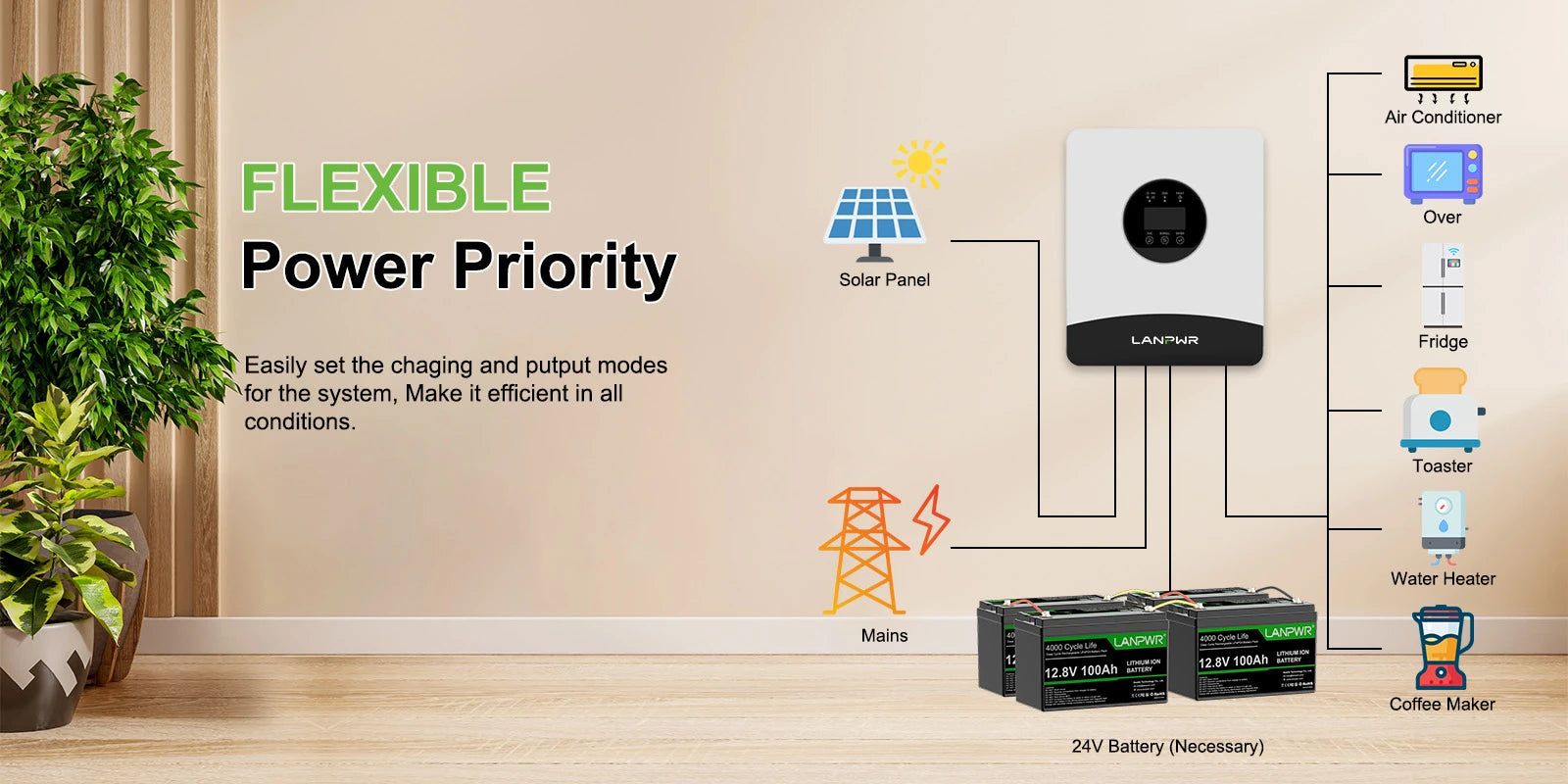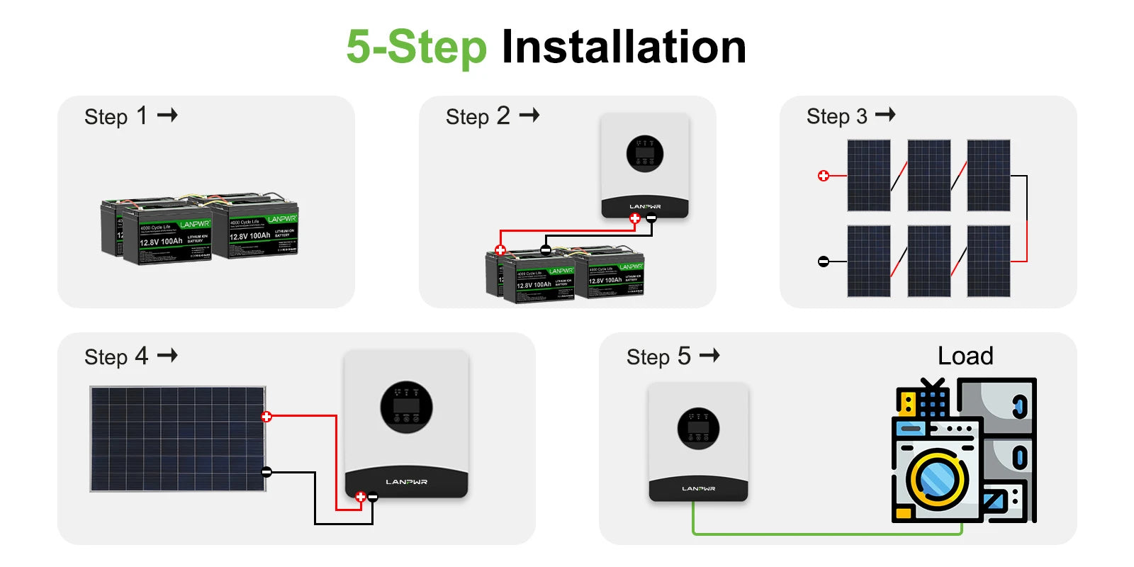 One-Stop Solution: LANPWR Off-grid 3000W 5120Wh 24V Complete package includes everything you need to enhance your off-grid live - 4x12V 100Ah LiFePO4 Lithium Battery, 24V 3000W inverter, battery connection cable, and circuit breaker.