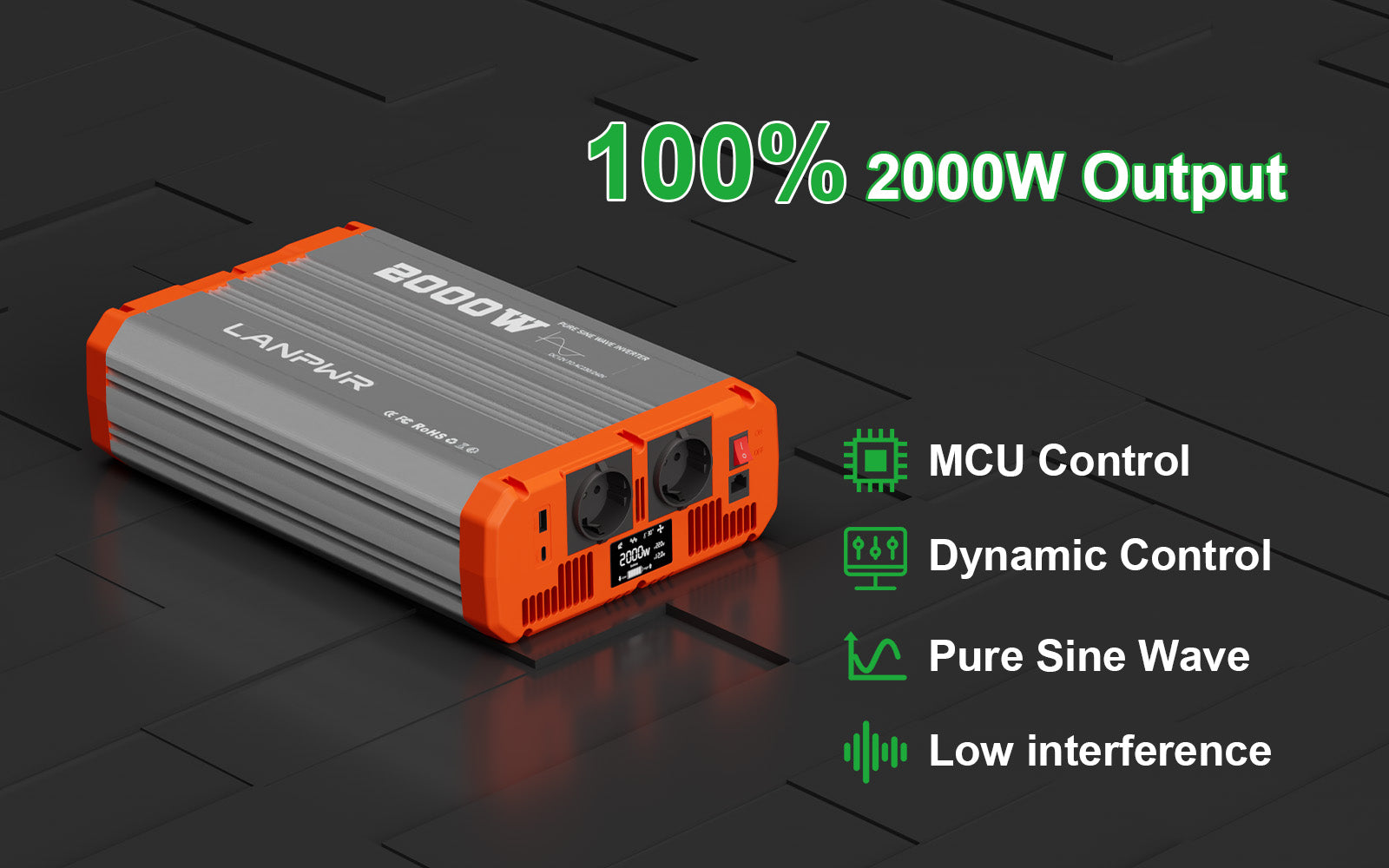LANPWR 2000W Pure Sine Wave Inverter provides seamless and continuous 2000W power output to ensure that you can use all kinds of electrical appliances with peace of mind in any situation. Its high-quality power output not only ensures the normal operation of the equipment, but also prolongs the service life of the equipment in an invisible way. It has been rigorously tested and verified to be true and reliable, defying any kind of testing.