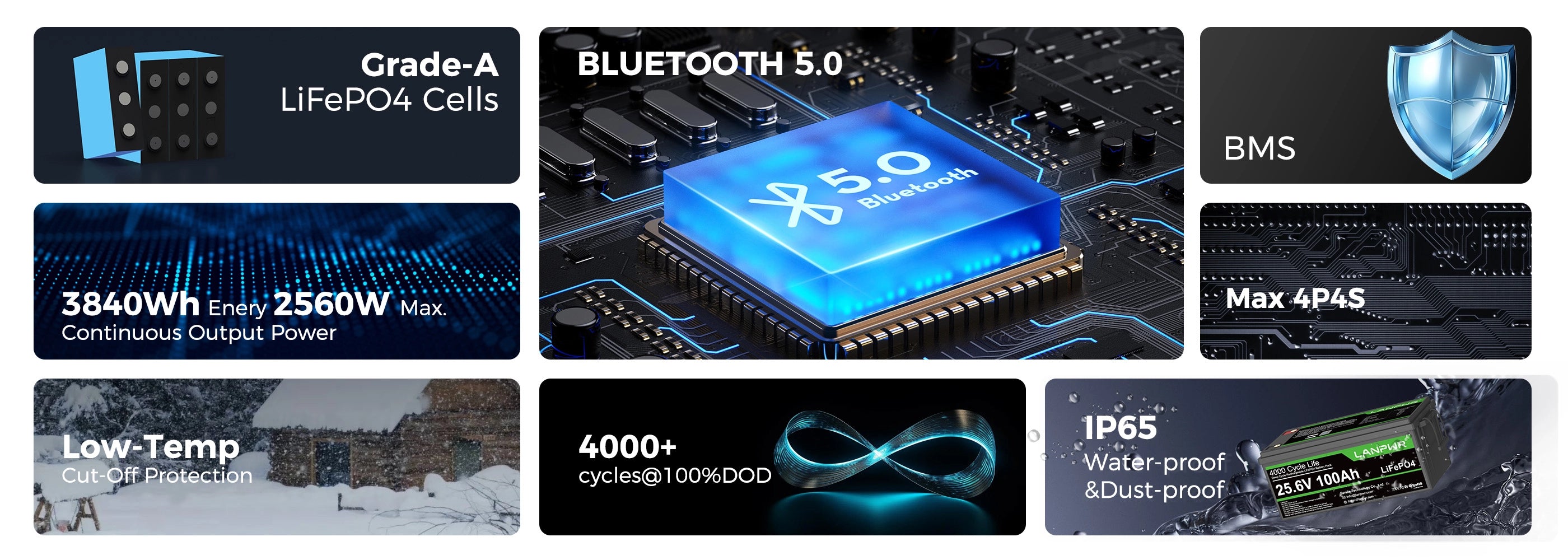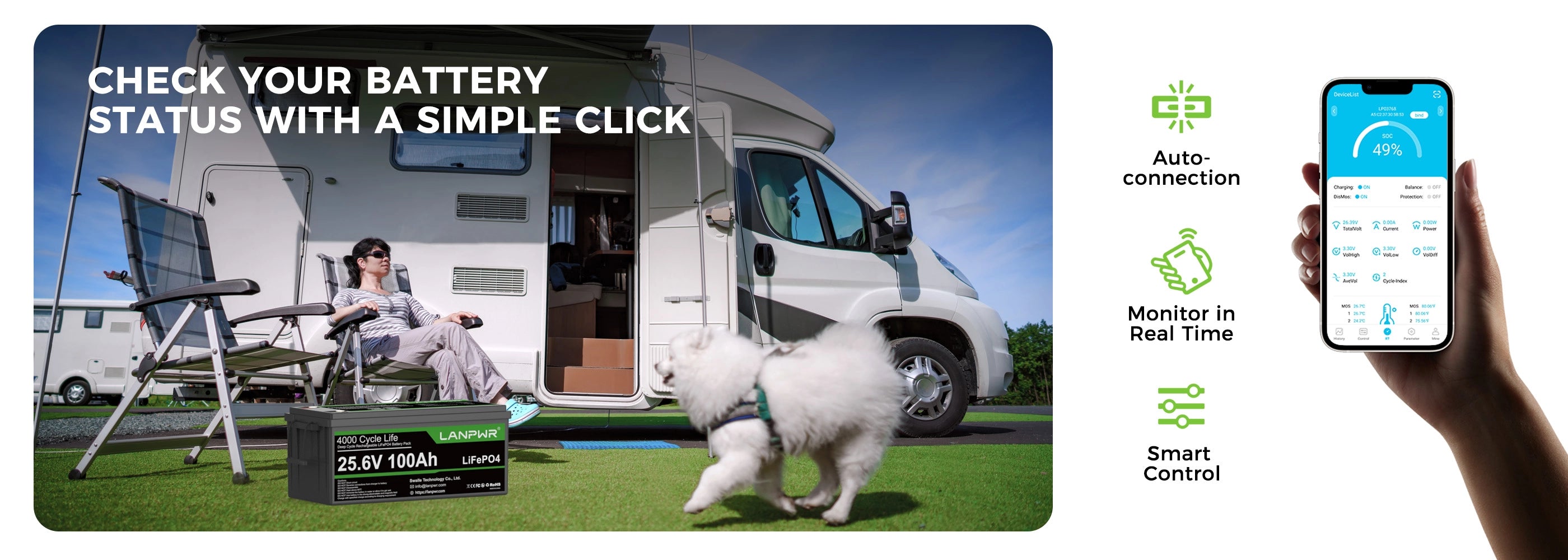 【Integrated Bluetooth, Real-Time Monitoring】Compared with traditional batteries, the LANPWR 24V 100Ah Bluetooth 5.0 LiFePO4 battery packs is equipped with Bluetooth function, and you can check the battery status such as battery voltage, current, battery capacity, and so on at any time through APP. Bluetooth connection range: within 10 meters of the battery.