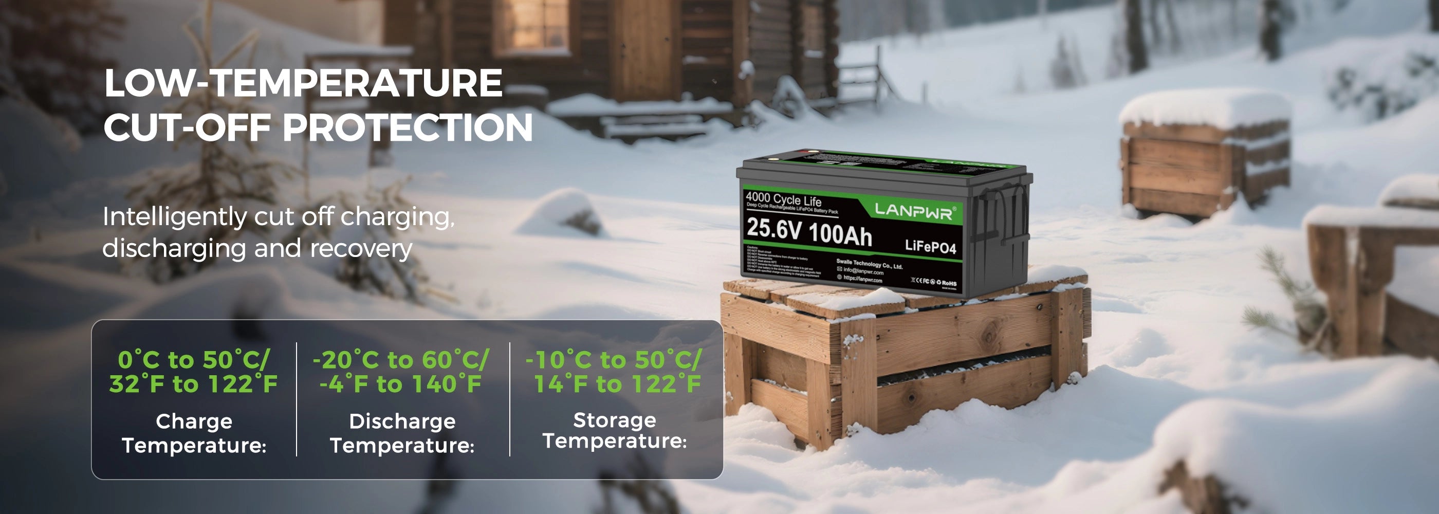 A: No need to worry – the LANPWR LiFePO4 lithium battery is designed with effective low-temperature protection. If the temperature drops below 32°F (0°C), charging automatically stops to prevent potential damage. Once the battery is connected to a charger with sufficient current, it will safely resume charging as the temperature improves. This feature ensures your LANPWR LiFePO4 battery remains safe and functional, even in colder conditions.
