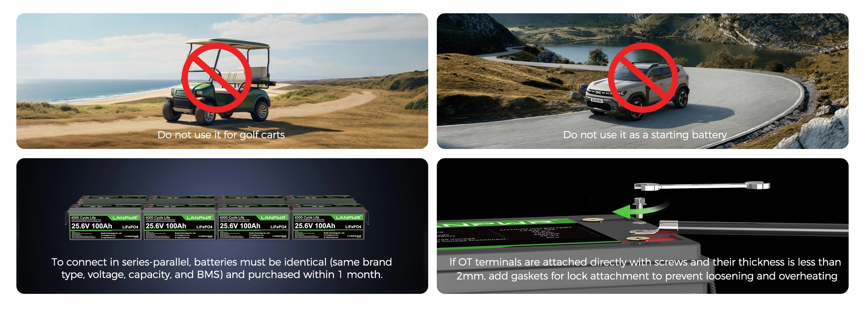 *NOTE: Do not charge below 0℃. Do not use as a starter battery (e.g. for golf carts. If you need a starting battery, please contact the LANPWR team). When batteries are used in series or parallel, the voltage difference should be controlled within 0.2V and the SOC should be controlled within 5%.